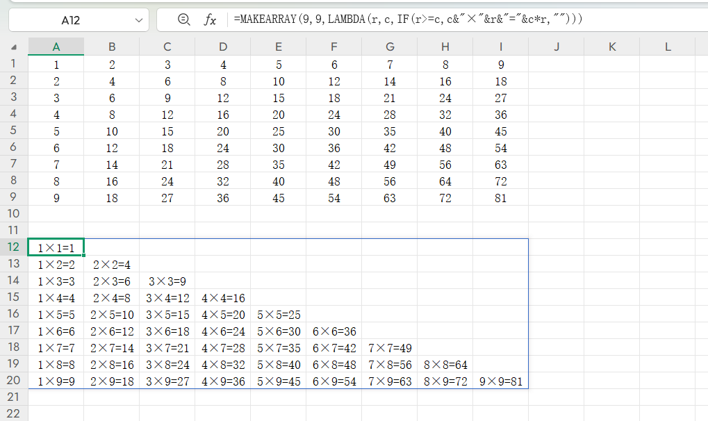 进一步用=MAKEARRAY(9,9,LAMBDA(r,c,IF(r>=c,c&"×"&r&"="&c*r,""))),仅显示下三角部分。