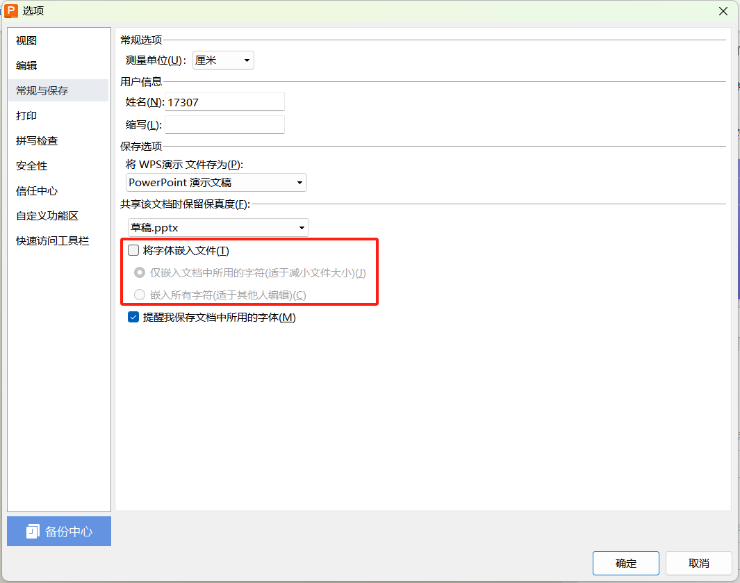 1.【文件】→【选项】→【保存】,勾选“将字体嵌入文件”;