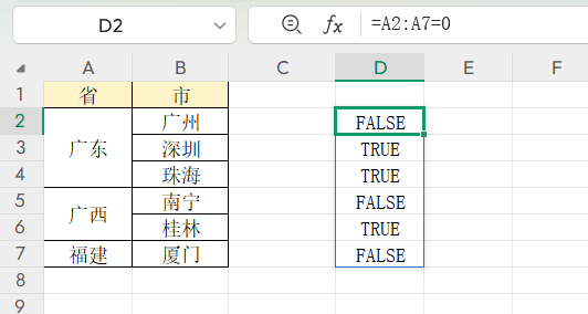 该公式会返回逻辑数组,FALSE对应有省名的单元格,TRUE对应合并后的空单元格,以此标记数据分组边界。
