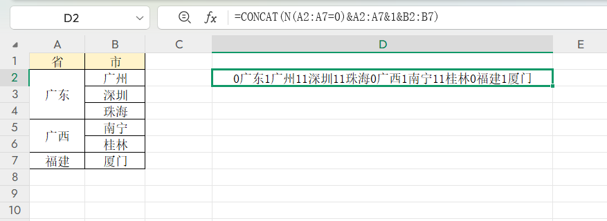 通过“&”串联省、市数据与标记符“1”,公式为: