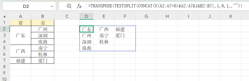 - 第6参数“”:异常值显示为空,最终得到横向“省+多市”结构。