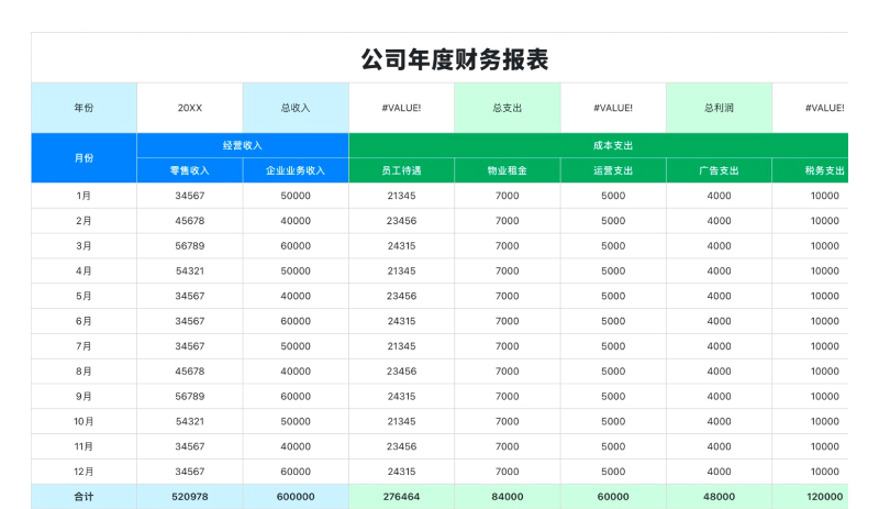 该模版是企业财务部门的核心工具。通过分类记录收入、支出、成本及利润数据,帮助管理层快速掌握公司经营趋势,助力战略决策。