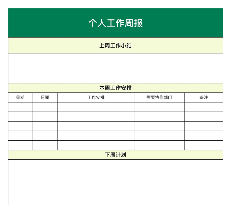 是职场人最常用的 excel模版 之一。通过填写本周重点工作与下周计划,管理者能快速掌握项目进度,减少重复汇报与会议时间。