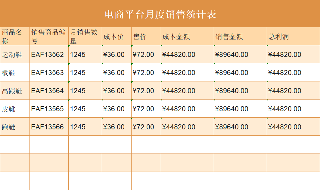 以月度为周期,汇总不同商品的成本、售价、总利润等数据,清晰展现电商平台的月度销售成果。