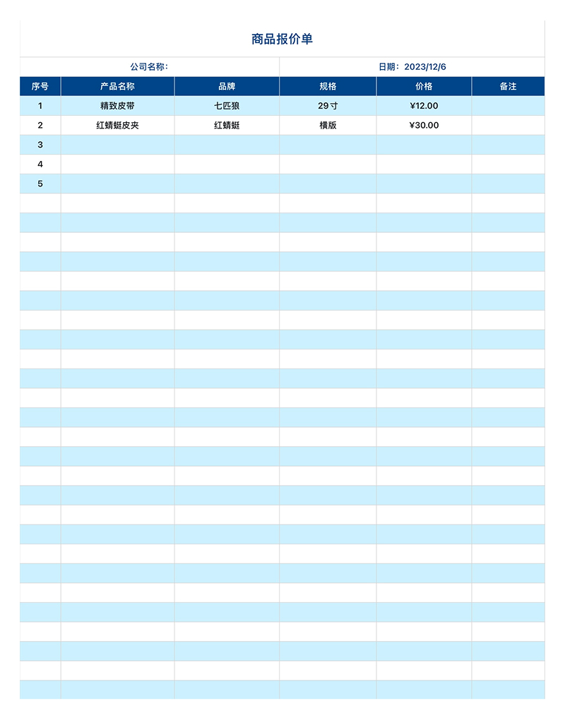 这份 excel模版 专为销售与采购人员设计,字段涵盖商品名称、规格型号、数量、单价及合计金额。通过数据汇总,报价清晰可查,不仅减少人工计算错误,还能提升企业报价的专业度。