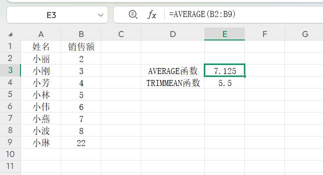 TRIMMEAN按12.5%剔除(即两端各删1个):结果5.5万元,更贴近多数人真实业绩。