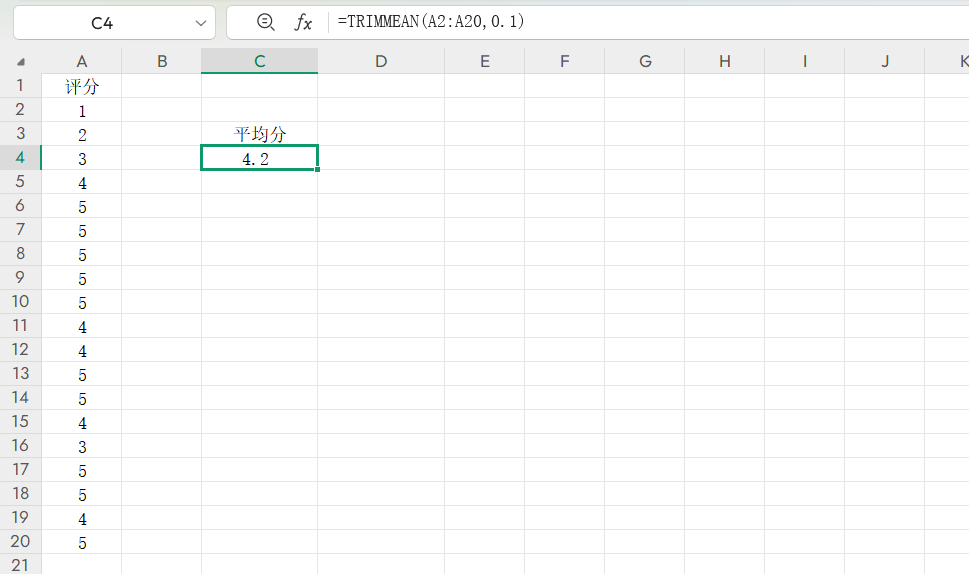 操作:输入=TRIMMEAN(A2:A20,0.1),自动删1和2,结果为4.2分,比普通平均3.8分更符合多数用户正面评价。