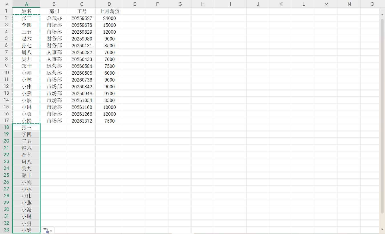 1.以下图为例,首先复制A2:A17的数据,粘贴到A18;