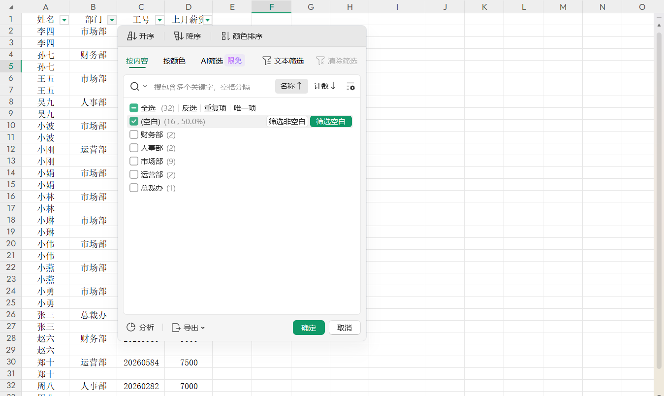 3.按【Ctrl+Shift+L】开启筛选,部门类别选择空白;
