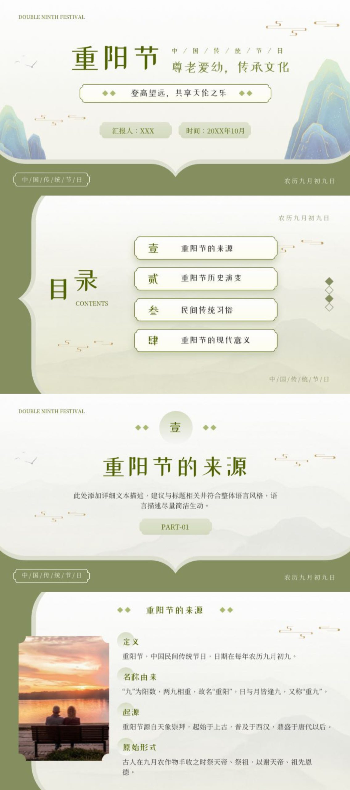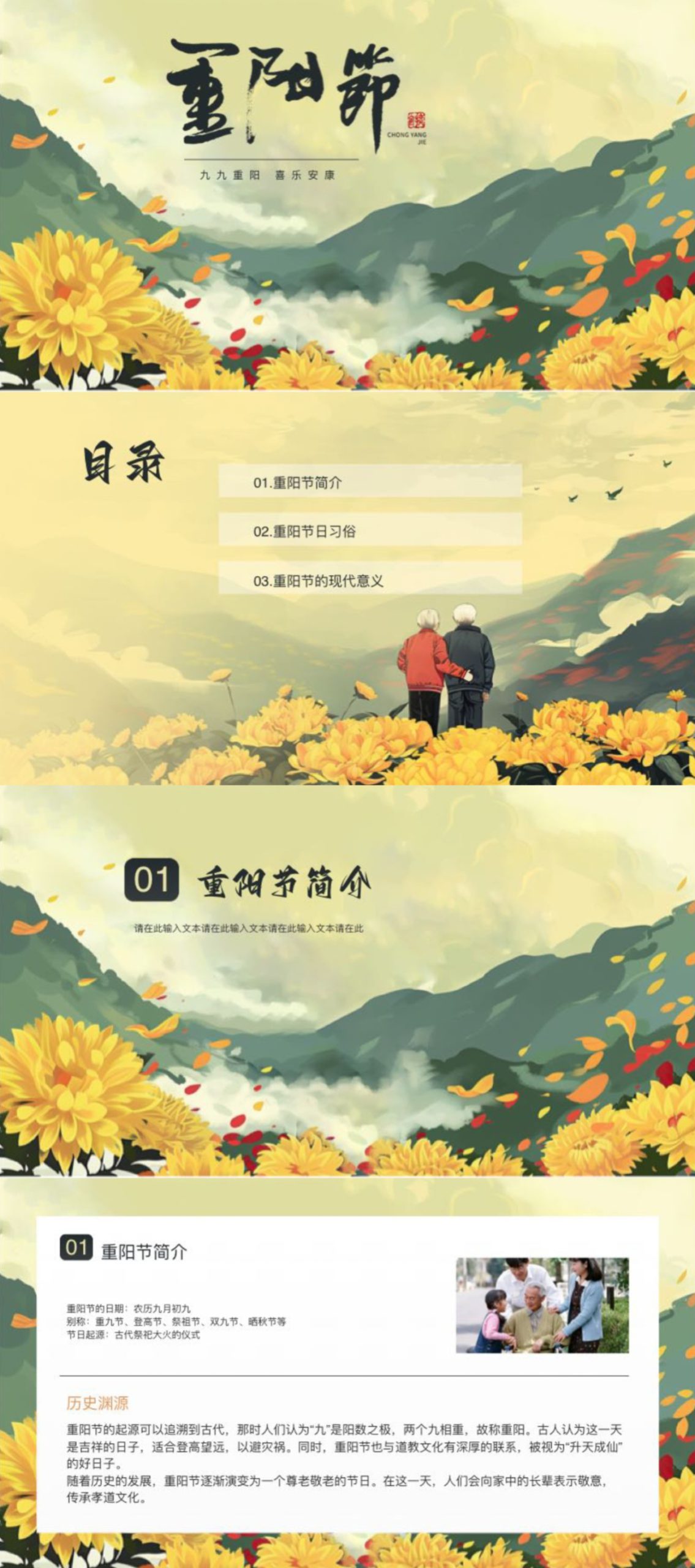重阳节作为中国传统节日,承载着深刻的文化内涵与登高的民俗意趣,而挑选契合的PPT模板能让重阳节文化传播更具感染力。以下为大家推荐4款可结合重阳节主题的优质PPT模板,助力清晰呈现重阳节的历史习俗与精神内核。
