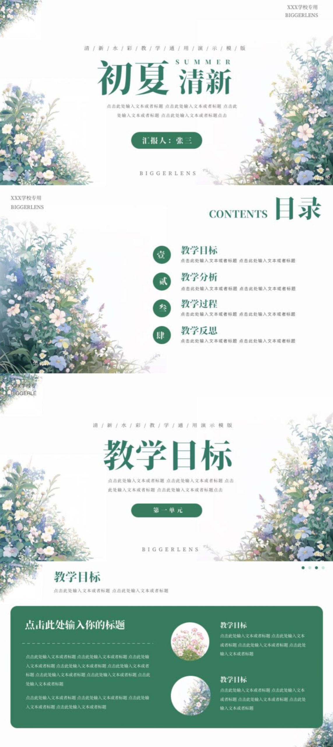 以清新水彩花卉为视觉基调,可灵活调整内容为重阳节主题,用于呈现重阳教学目标、过程等,为节日知识讲解增添雅致感。