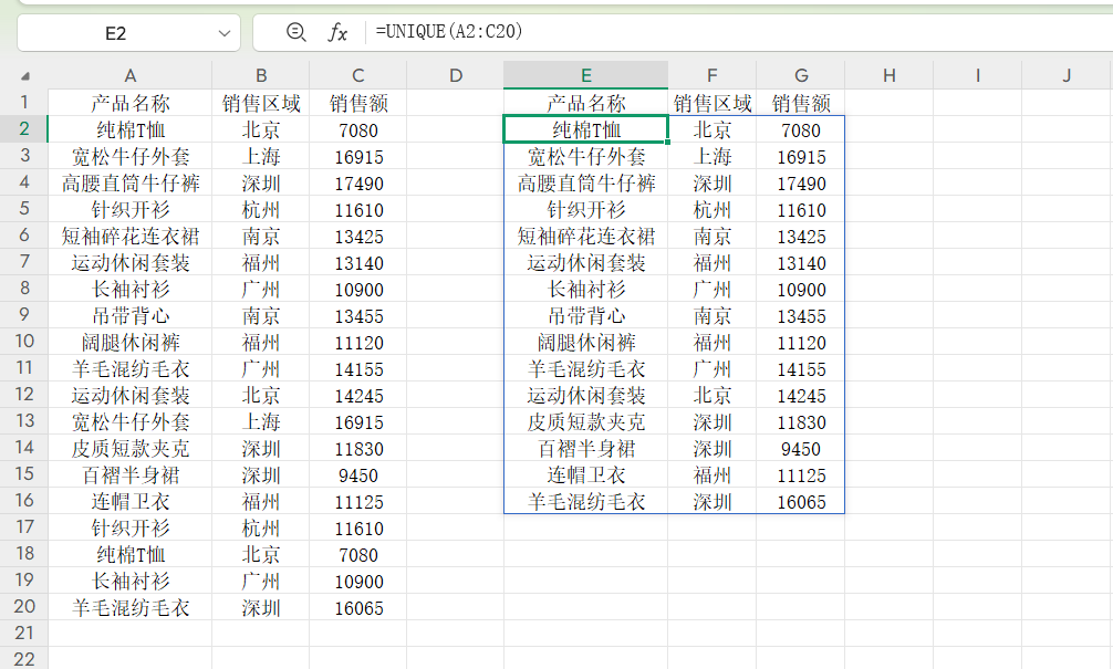 2.多列去重:以销售表为例,若需“产品+区域+销售额”完全一致才去重,公式为=UNIQUE(A2:C20),注意要明确“哪几列组合计算重复”,再确定函数的数据区域,避免结果不符预期。