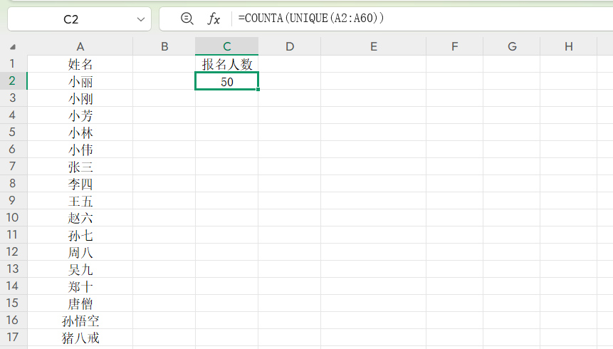 4.统计唯一值数量:以比赛报名表为例,统计实际参赛人数(唯一姓名数量)时,可用COUNTA搭配UNIQUE函数,