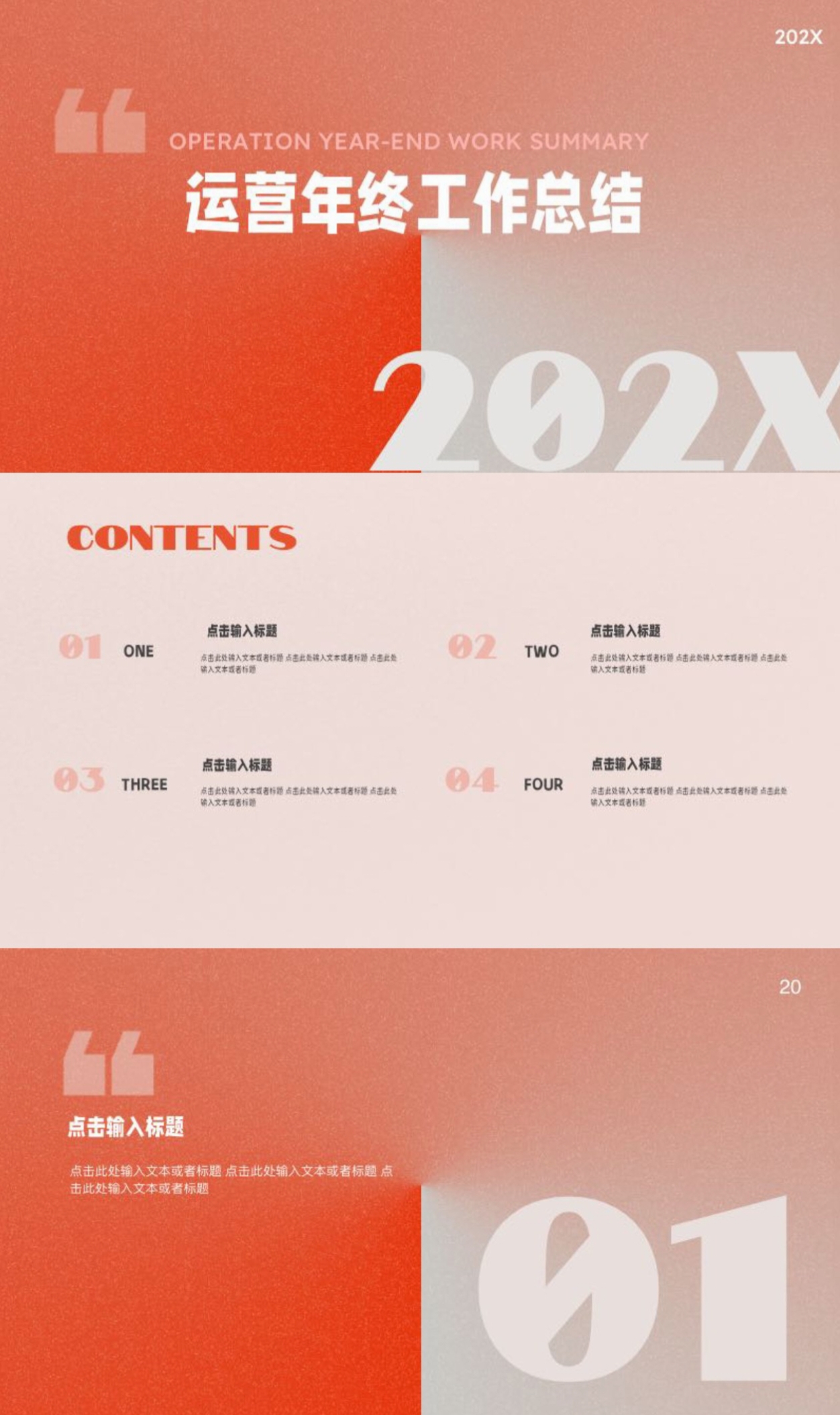 - PPT模板:橙红渐变+202X年份设计模板,其色彩基调与结构划分,可直接承接技巧落地,提升汇报专业性。