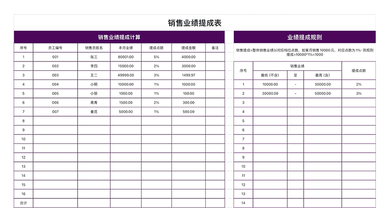 专为销售团队设计。模版可以计算业绩达成率与提成金额,避免手工误差,同时支持按员工编号汇总,让绩效统计更清晰。