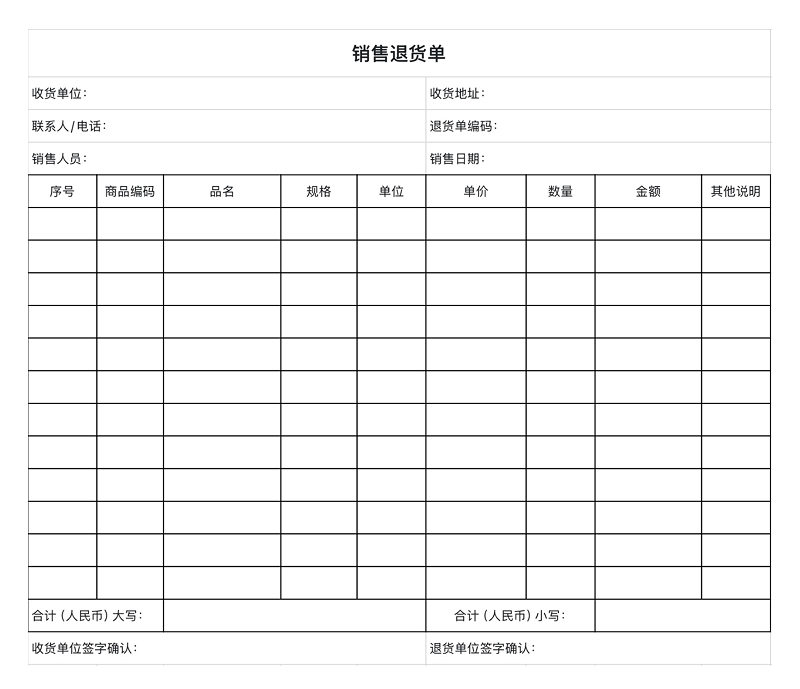 售后环节同样重要。通过标准化的退货单模版,可快速登记退货商品信息、数量、金额及原因,确保财务、仓储、销售数据同步更新。