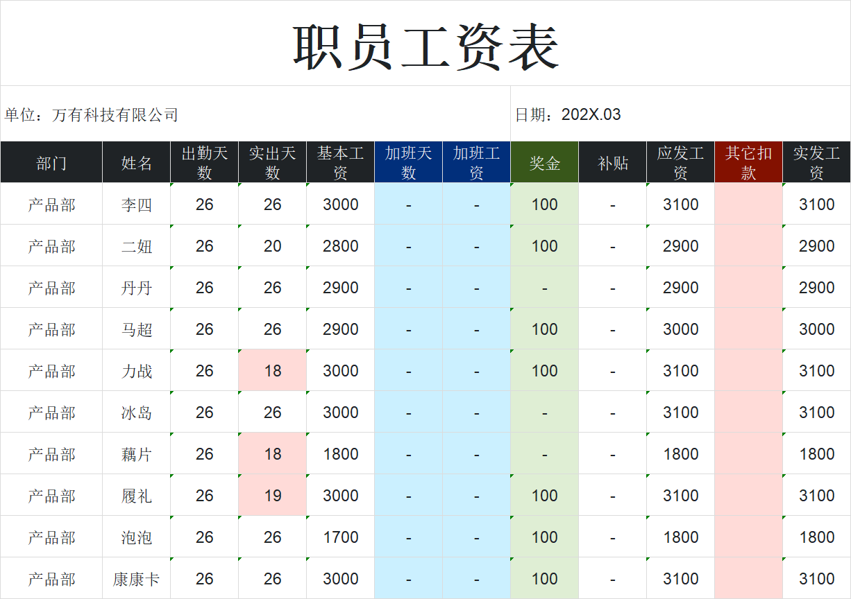 涵盖出勤、加班、奖金等多项内容,清晰呈现职员薪资构成与计算过程。