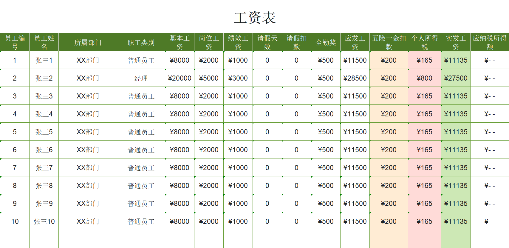 可自动计算五险一金、个人所得税等,快速得出员工实发工资。