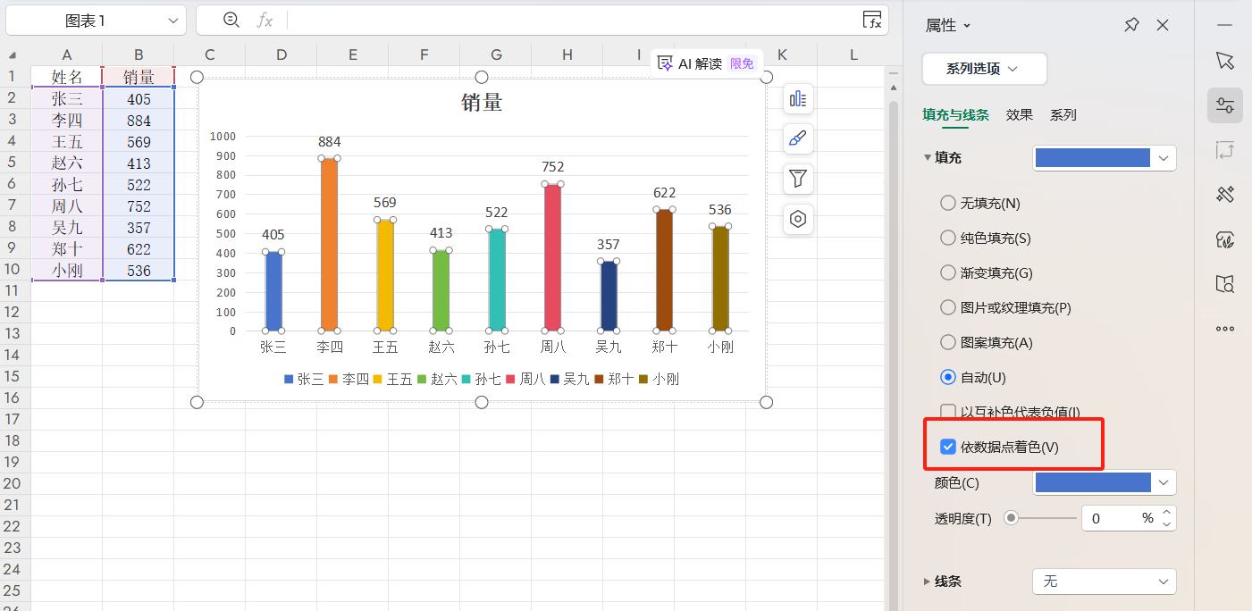 双击选中图表中的数据条,在弹出的格式窗口中找到【填充】选项,勾选【依据数据点着色】,即可让不同数值的数据条呈现差异化颜色,数据对比更清晰。