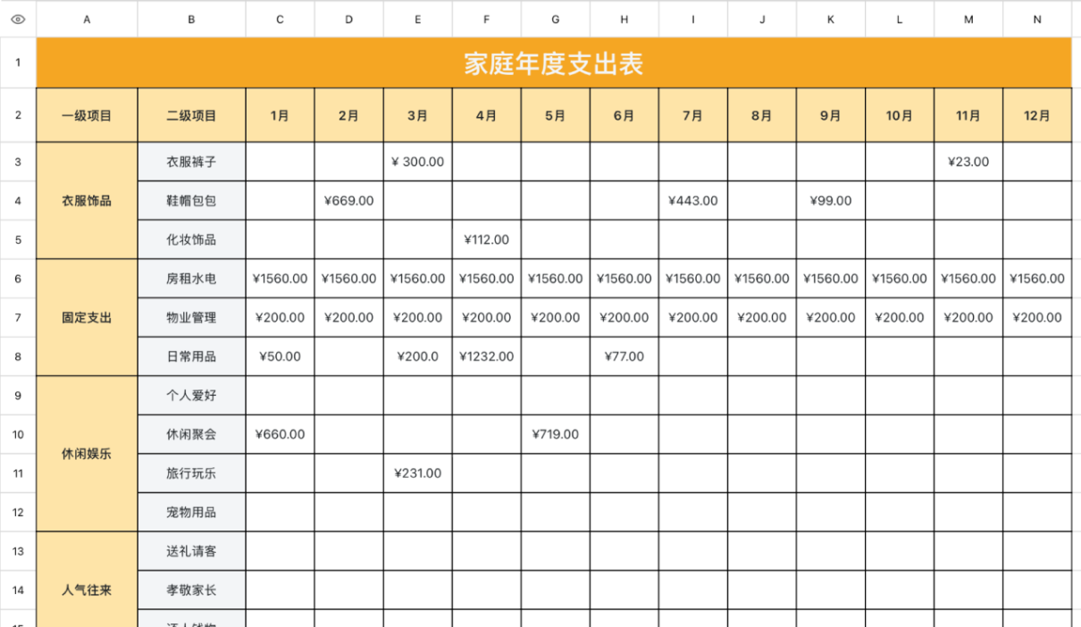 想知道钱都花哪儿去了?这个模板能轻松记录家庭日常开销,包括生活支出、娱乐消费、教育、礼金等。清晰的分类和年度汇总功能,让家庭预算规划更有方向。