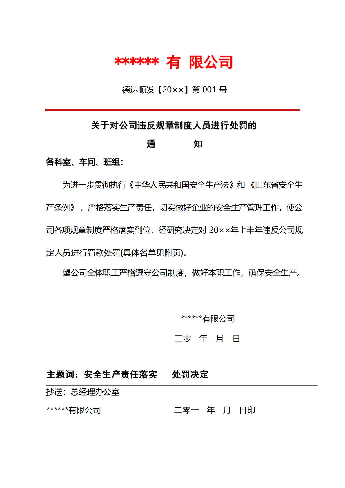 通过红头文件的正式形式,对公司内部违反规章制度的人员或行为作出处罚决定并公示,维护公司管理秩序。