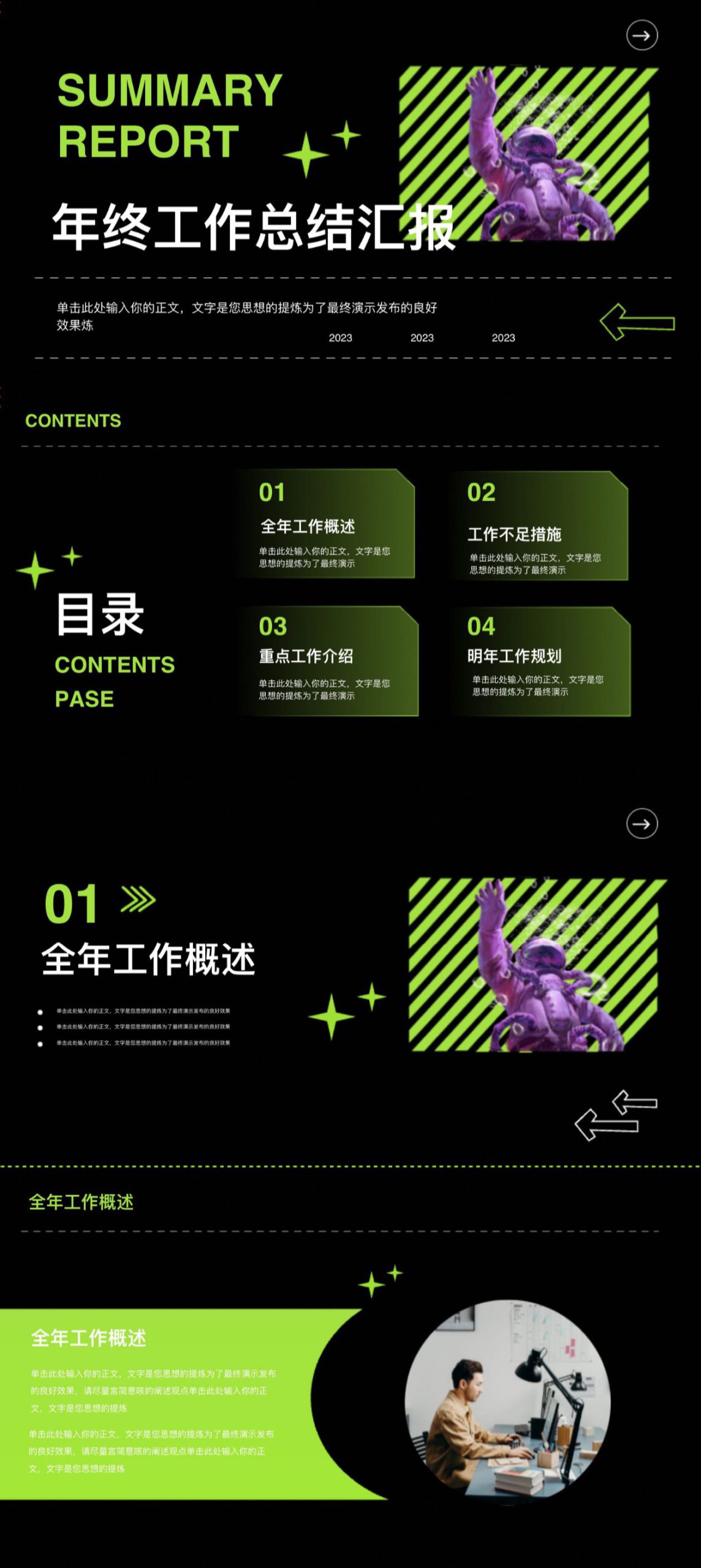 绿色创意风打破汇报常规,以潮流设计适配互联网、创意行业,让年终总结轻松脱颖而出。