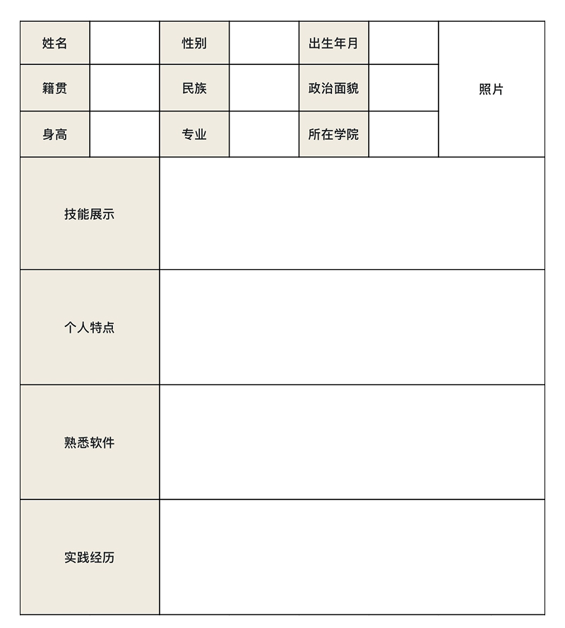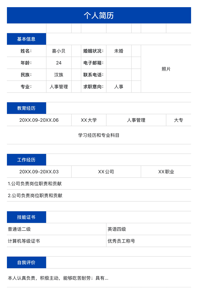 适用于学生或社团干部,模板包含基本信息、技能展示和个人特点。使用 这款Excel 简历模板,可以突出学习成长轨迹和社团贡献,让经历更有逻辑。
