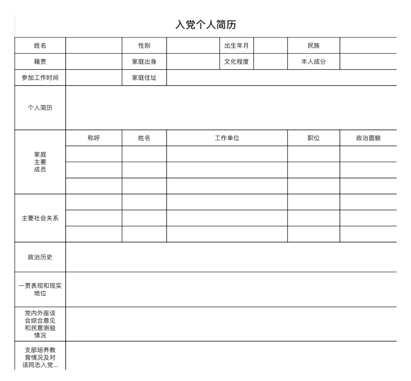 专为申请入党或党内评优设计,包含基本信息、个人简历、家庭成员和主要社会关系等板块。借助模板,政治经历和组织实践可以完整记录,避免遗漏重要信息。