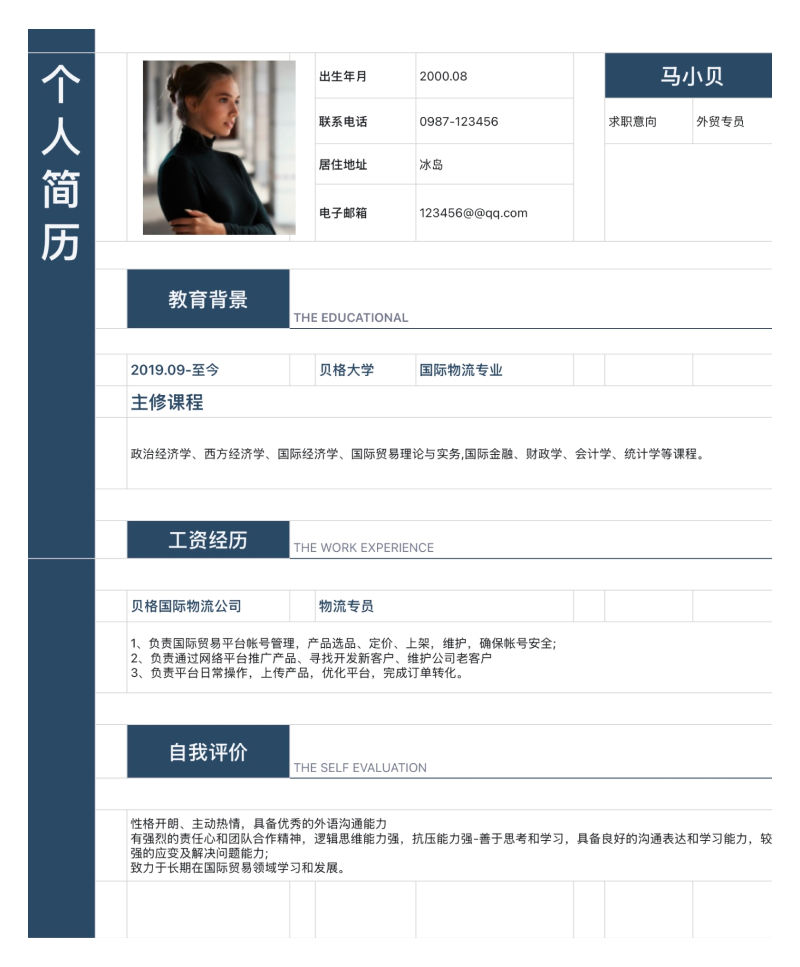 适合物流岗位申请者,模板覆盖教育背景、工作经历和自我评价。通过这款 Excel 简历模板,求职者能突出专业技能和岗位匹配度。