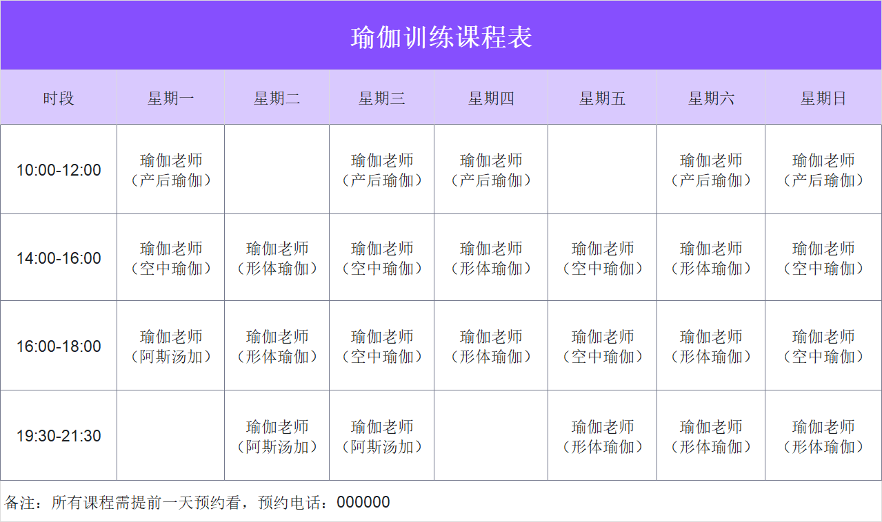 明确瑜伽课程时段与类型,涵盖产后瑜伽、空中瑜伽等多种课程,方便瑜伽爱好者预约参与,规律练习。