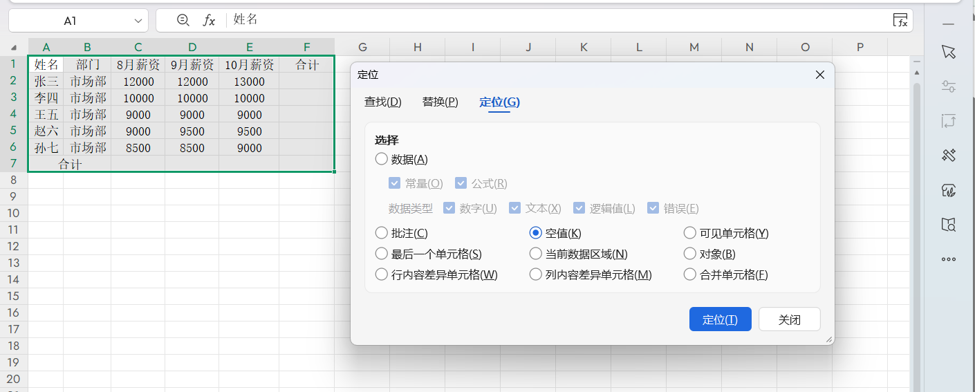 2.按“CTRL+G”调出定位对话框,点击“定位条件”选择“空值”并确定;