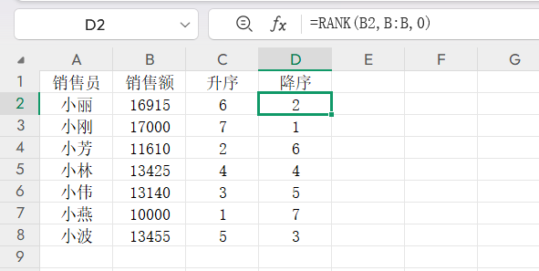 适用于业绩评比等场景,公式:=RANK(B2,B:B,1)