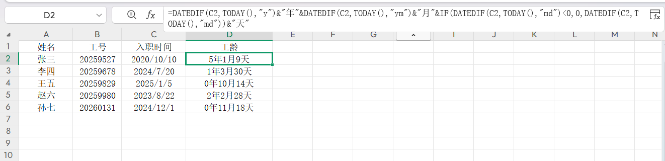 TODAY()可自动更新当日日期,也可替换为固定日期,下拉公式即可批量算出所有员工工龄,规避闰年误差。