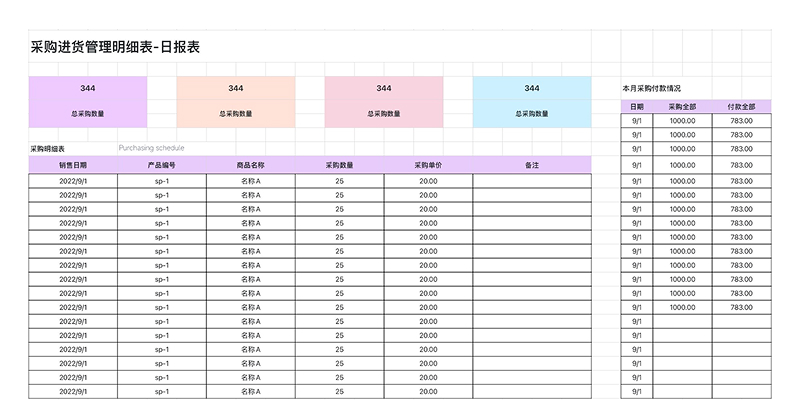日常采购较频繁的行业,如餐饮、制造、零售,都适合使用这份 采购进货表(日报表)。模板可记录进货品类、数量、单价、总额和付款状态,帮助团队随时掌握每日采购情况,避免遗漏与重复采购。