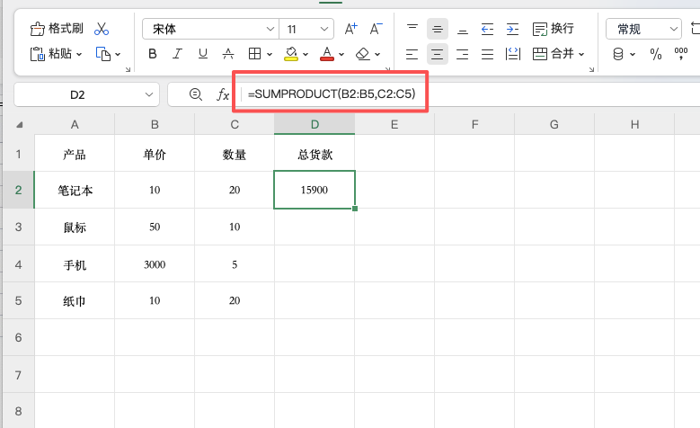 例如需要统计总货款,只要将数量列与单价列作为两个数组传入即可: