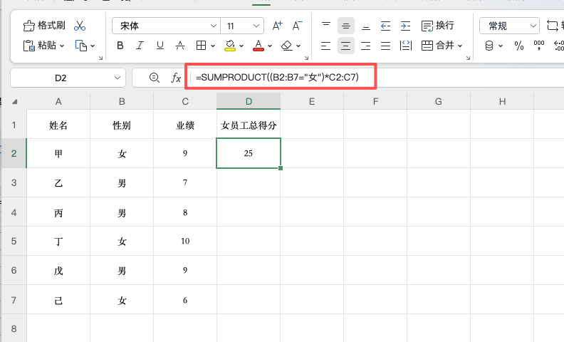 如果你想统计“女员工的业绩总和”,可以利用逻辑判断生成 0/1 数组,再与业绩分数相乘: