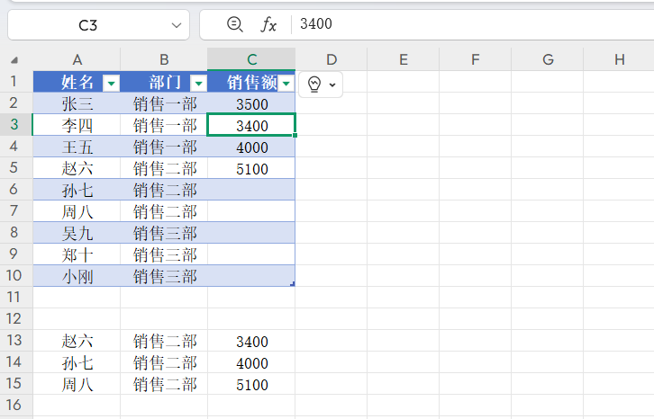 假设我们有一份员工数据表,按“销售二部”筛选后,仅显示该部门员工信息。