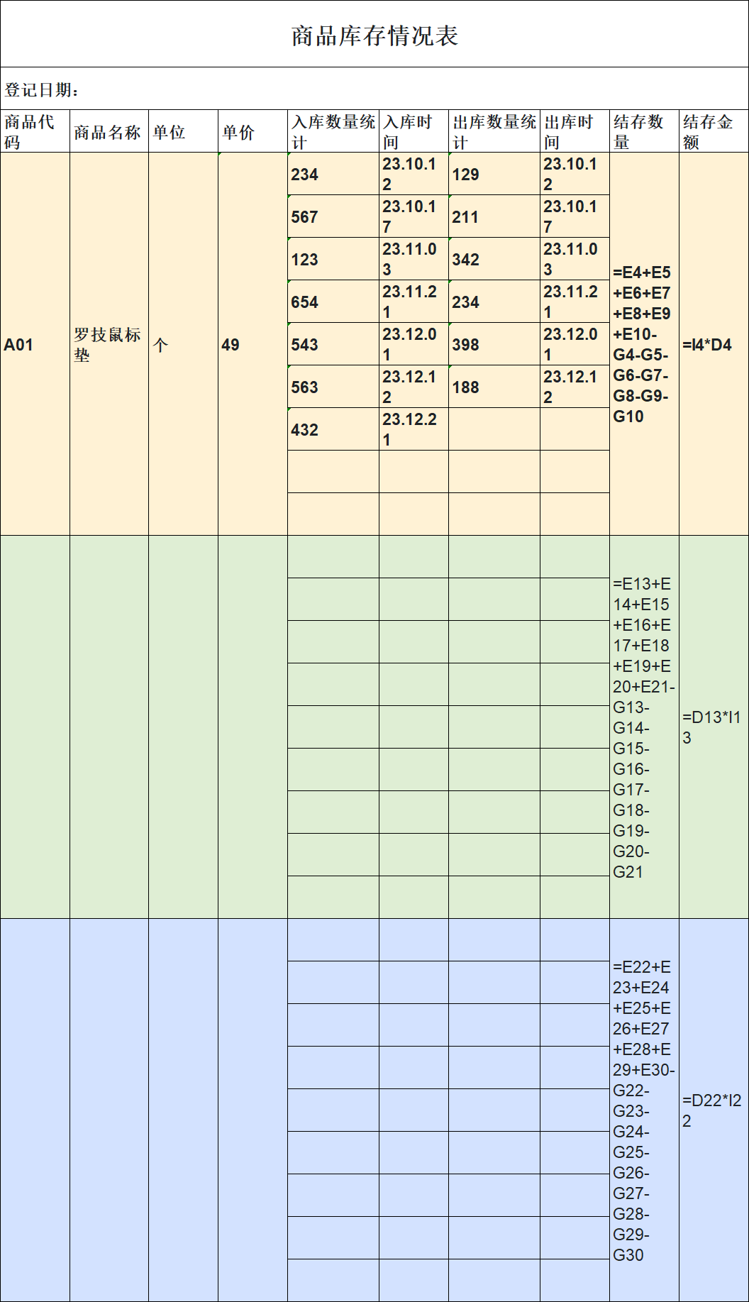含时间维度的商品库存跟踪表,支持入库/出库时间、结存金额自动计算,适配商品类库存的精细化管理。