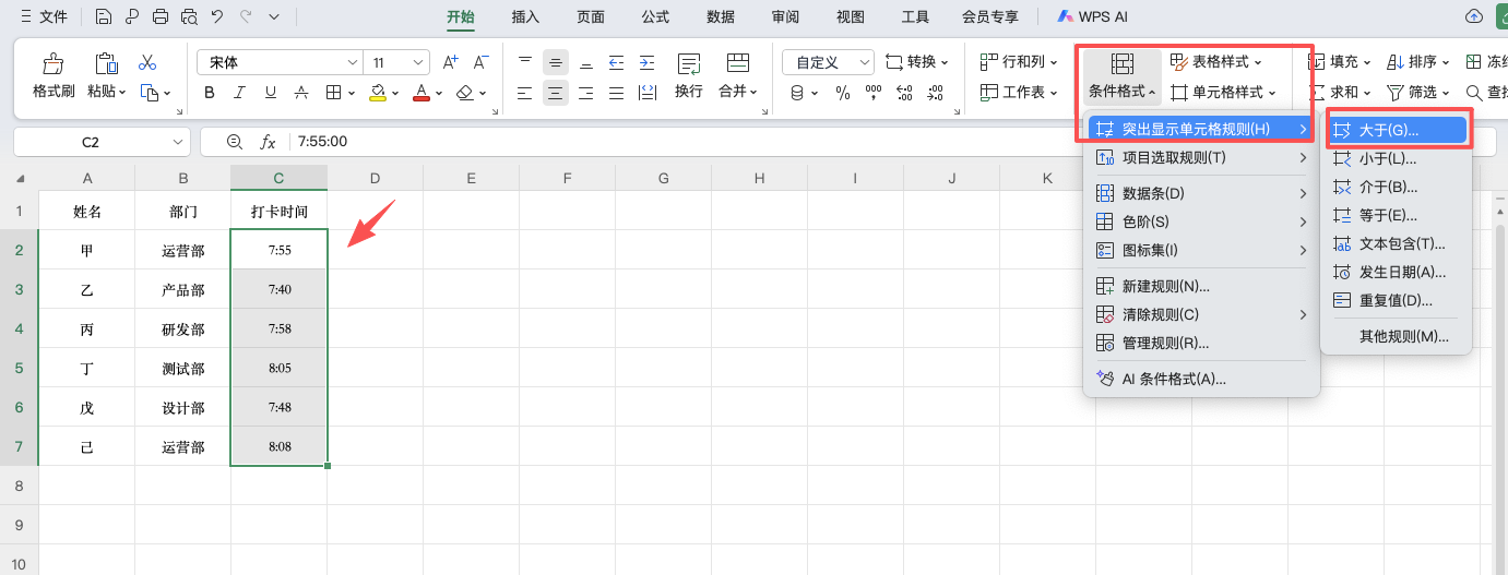 假设你的打卡时间存放在 C 列,需要找出所有晚于 8:00 的记录,只需按照以下步骤操作: