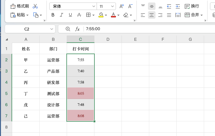 在处理考勤表时,HR 经常需要从大量打卡数据中判断员工是否迟到。如果手动筛查,不仅耗时,还容易漏掉关键记录。其实,Excel 的条件格式就能自动完成这项工作,实时标记超过上班时间的打卡值,让迟到情况一目了然。下面将以“超过 8:00 算迟到”为例,演示如何利用 Excel 条件格式快速标注所有迟到记录。