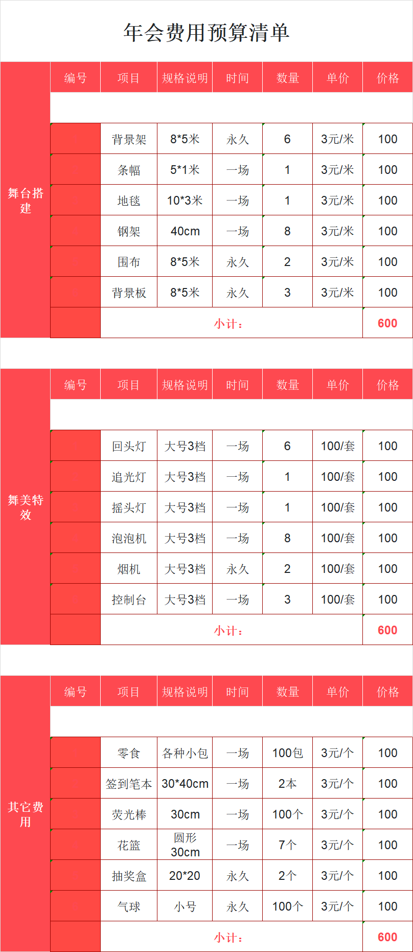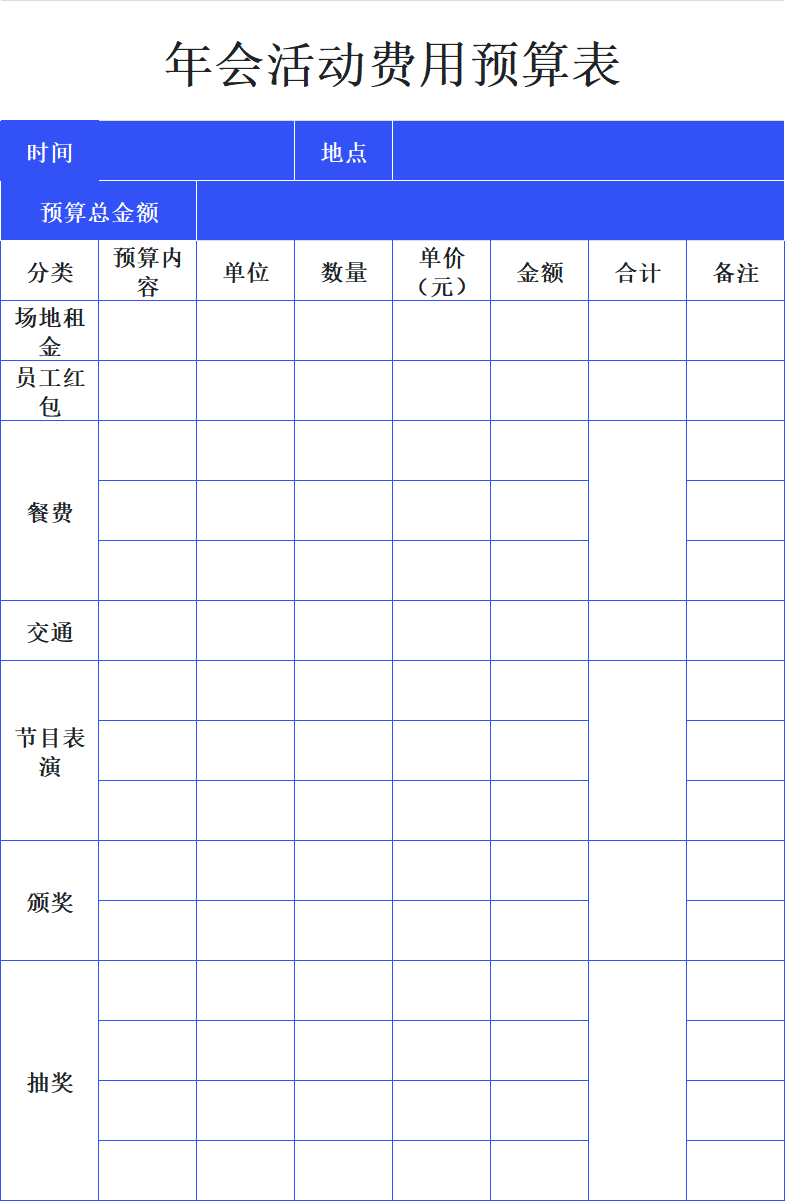 以活动模块为核心,覆盖场地、红包、餐费等全流程支出的基础型预算表。