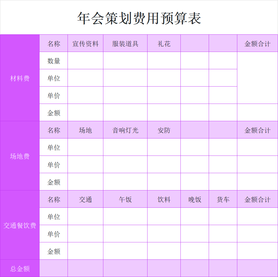 按材料费、场地费等大类划分的综合型预算表,匹配策划全周期预算统计。