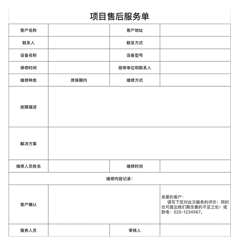 项目完成后,售后信息通常繁杂,尤其涉及客户沟通、问题处理和后续跟踪。通过 项目售后服务单,可以系统记录客户反馈内容、处理状态、解决方案及时间,帮助团队缩短响应周期,让售后处理流程更加规范透明。