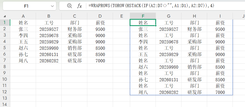 在Excel数据整理中,“表头”是规范展示的核心。但有些数据,比如工资条,单表头的话容易混淆,给每行添加表头能让数据更独立。今天分享2个高效公式,轻松实现“一行